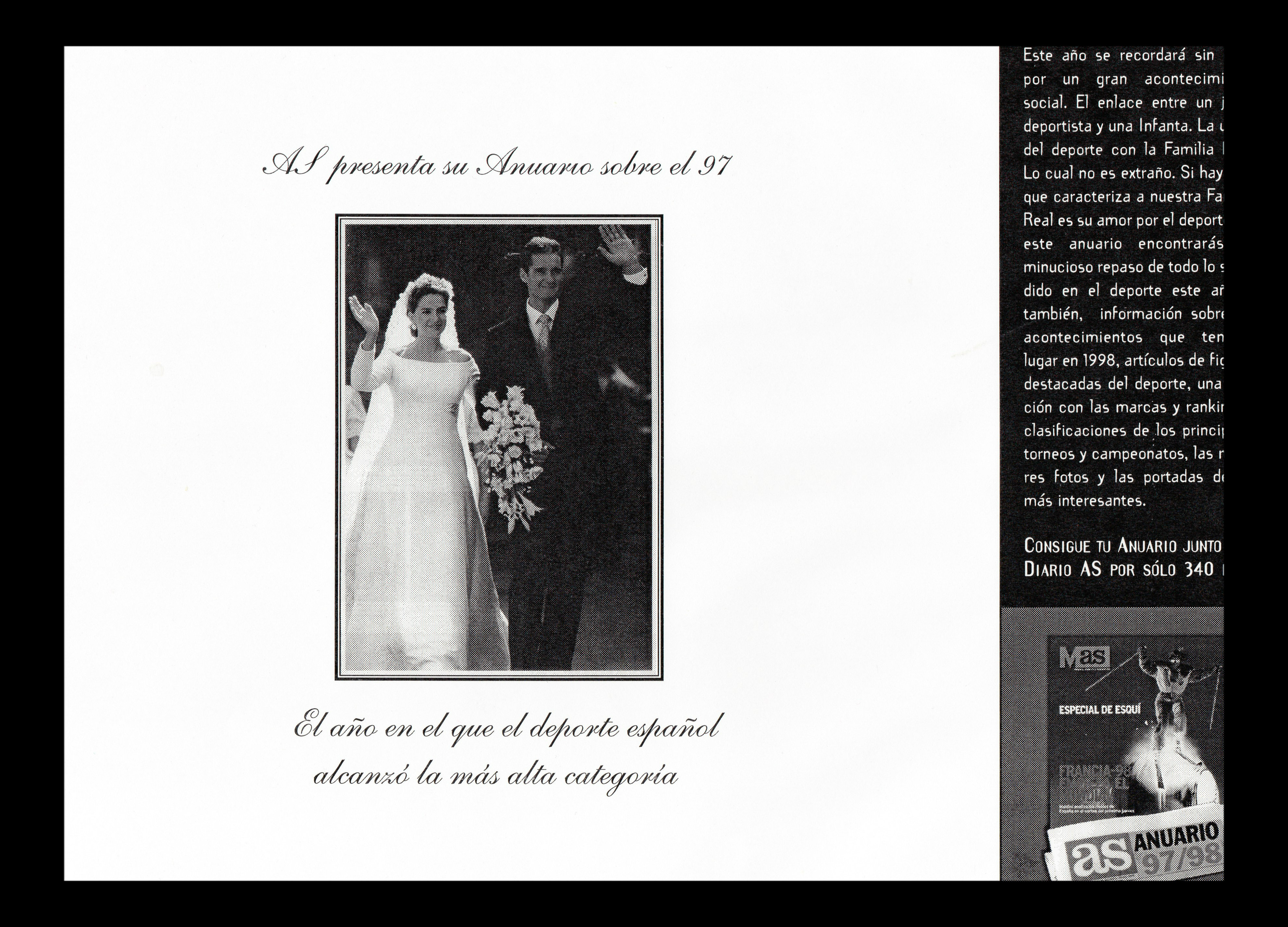 Habían transcurrido ya unos años desde la publicación del anuncio de Vogue Novias y estaba yo en Remo cuando el diario deportivo AS nos pidió una pieza para anunciar su Anuario de 1997. Ese año había sido el de la boda entre la Infanta Cristina y el que entonces era considerado una estrella del balonmano, Iñaki Urdangarin. Nadie suponía en aquellos momentos que el flamante novio, a la sazón símbolo del deporte patrio, acabaría convertido en un ejemplo de la sinvergonzonería nacional, así que presentamos a AS el siguiente anuncio, pensando que habíamos dado en el clavo con nuestra idea. Y es que aunque los creativos a veces nos comportamos como semidioses, no se encuentra entre nuestras habilidades el don de la profecía.