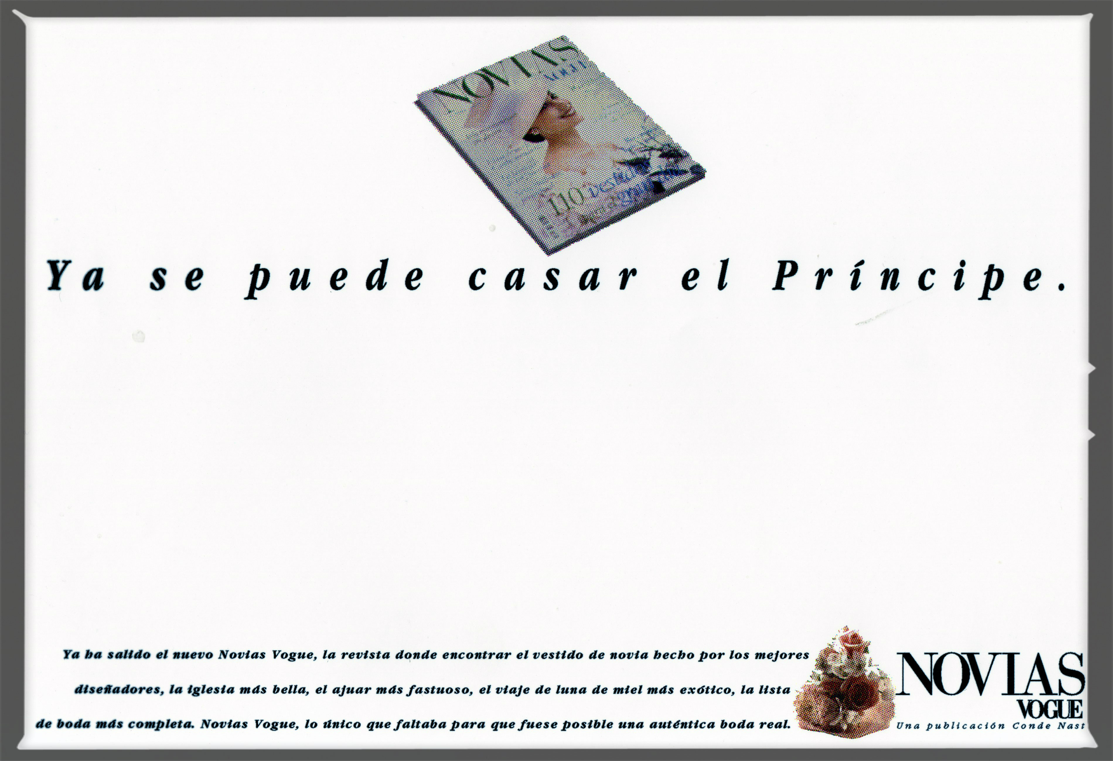 Estaba yo en Casadevall Pedreño & PRG cuando Vogue nos encargó una campaña para promocionar su revista para Novias. Desde el primer momento lo tuvimos claro: se trataba de vender elegancia, distinción y «glamour», una publicación para bodas con clase. En aquellos días nuestro actual rey, Felipe VI, era todavía un soltero de oro y no se hablaba ni de bodas ni de compromisos. Sin embargo, nos atrevimos a dar el pistoletazo de salida para todas las aspirantes a convertirse en la futura Reina de España y, efectivamente, unos años más tarde el Príncipe anunció su compromiso con la periodista Letizia Ortiz.