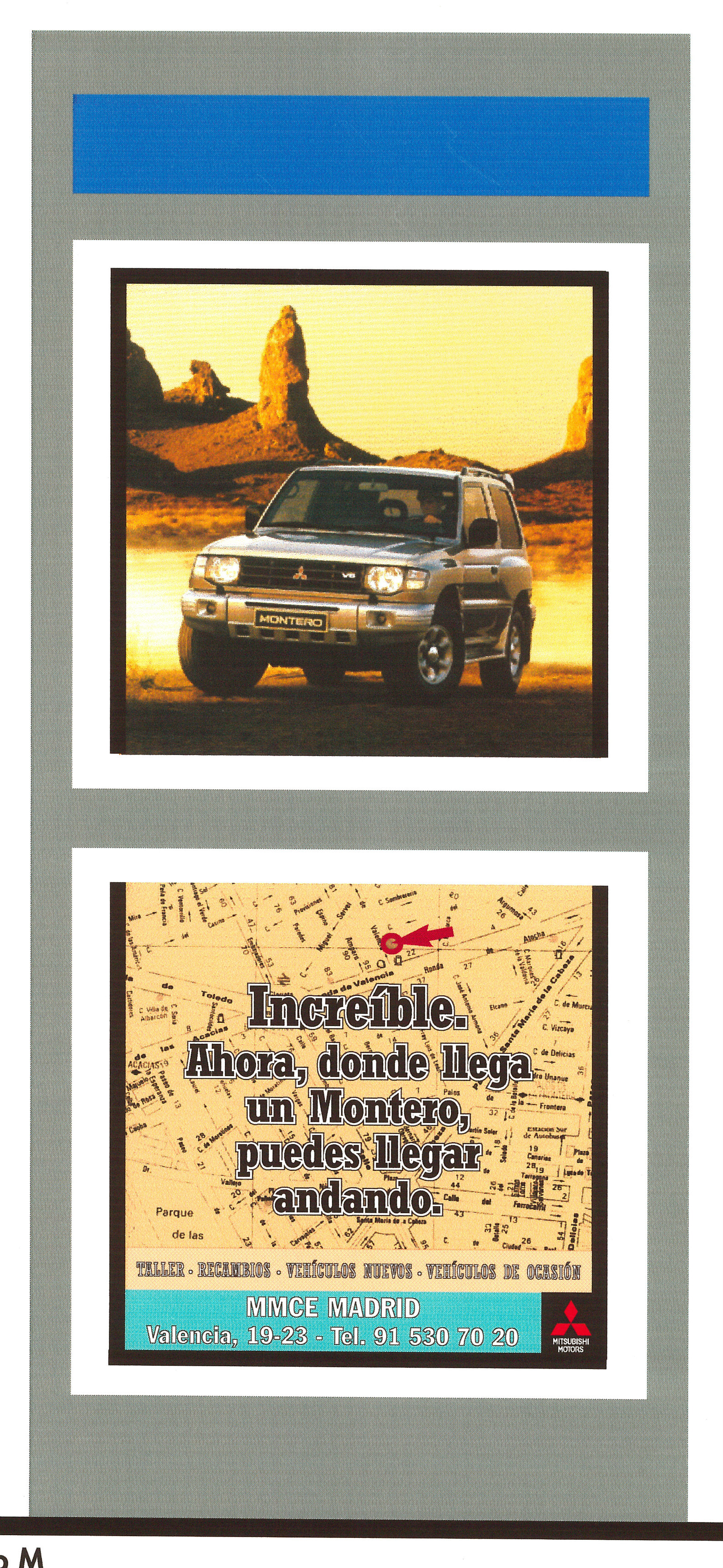 Siempre he pensado que la buena publicidad exterior es aquella que aprovecha las características de su emplazamiento para potenciar al máximo su mensaje. Estas tres cabinas forman parte de una campaña destinada a promocionar un concesionario Mitsubishi, uno de cuyos modelos, el Montero, se había convertido, tras el genial spot «Cabrero»,en el coche que te llevaba a donde nadie llegaba.