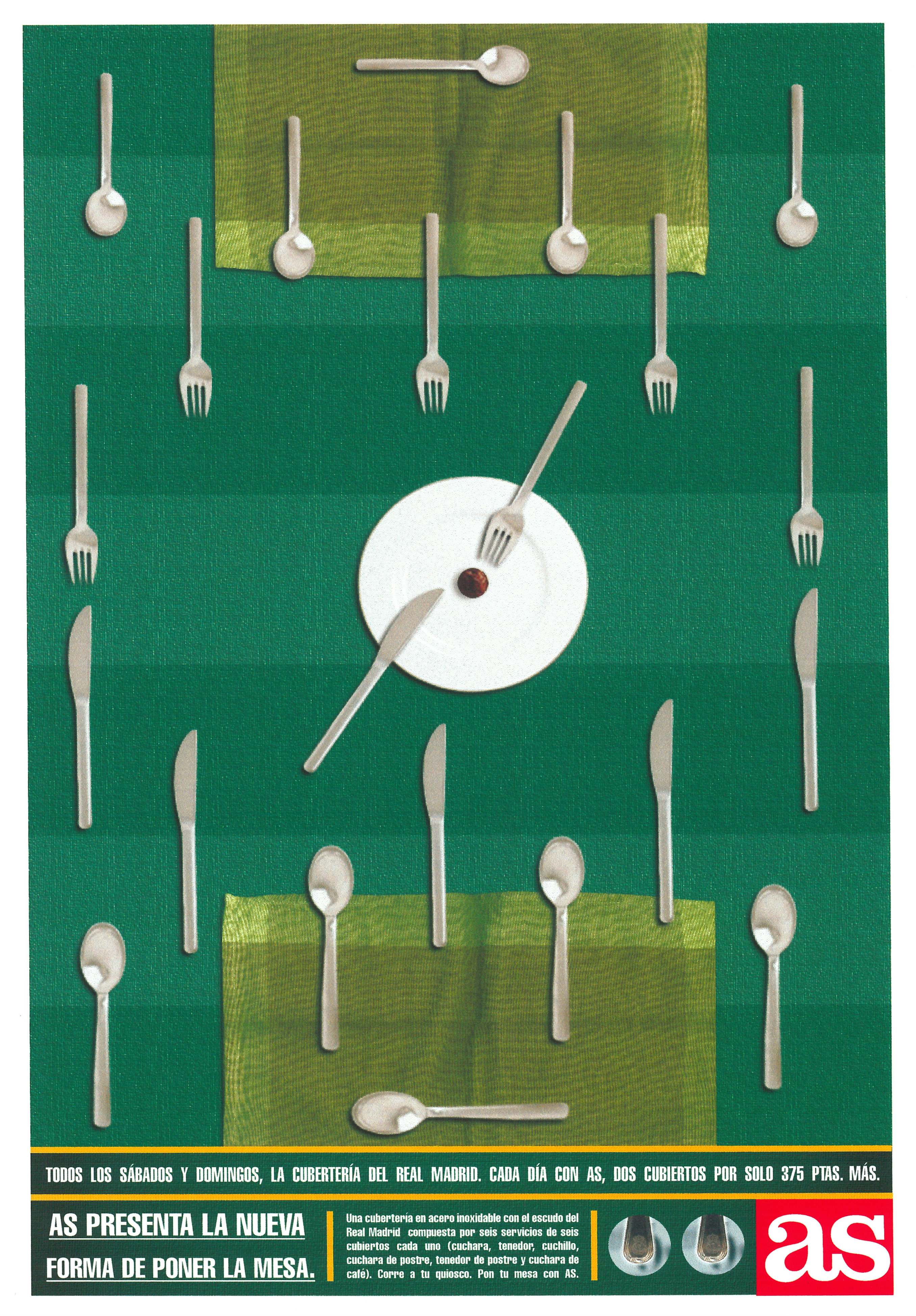 Aquí tenéis dos anuncios para el diario deportivo. El primero para dar a conocer una promoción muy curiosa: una cubertería con el escudo del Real Madrid que sin duda hizo las delicias de los aficionados merengues.